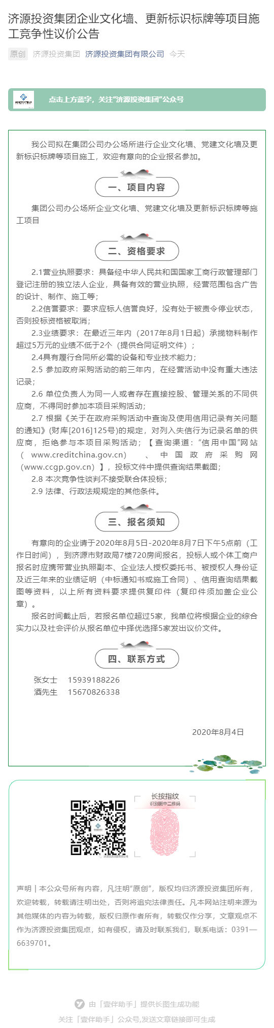 濟源投資集團企業(yè)文化墻、更新標識標牌等項目施工競爭性議價公告
