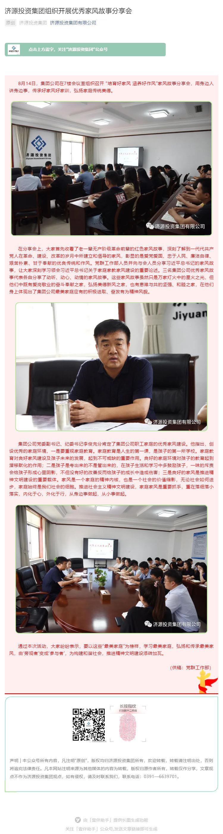 8月14日,濟源投資集團在7樓會議室組織召開 “培育好家風(fēng) 涵養(yǎng)好作風(fēng)”家風(fēng)故事分享會,用身邊人講身邊事,傳承好家風(fēng)好家訓(xùn),弘揚家庭傳統(tǒng)美德。