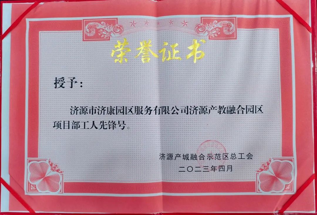 4月25日,濟源示范區(qū)總工會舉辦濟源示范區(qū)2023年五一勞動獎和工人先鋒號表彰大會。會上,濟源投資集團所屬河南省濟源市建設(shè)投資有限公司榮獲“濟源示范區(qū)‘五一’勞動獎狀”,濟源投資集團所屬濟源市濟康園區(qū)服務(wù)有限公司濟源產(chǎn)教融合園區(qū)項目部榮獲“濟源示范區(qū)工人先鋒號”。
