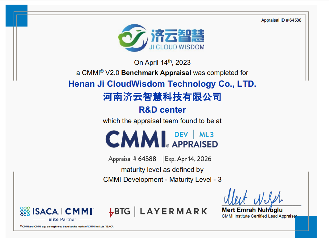 濟(jì)源投資集團(tuán)所屬濟(jì)云智慧公司通過(guò)CMMI3級(jí)認(rèn)證,科技創(chuàng)新力獲國(guó)際權(quán)威認(rèn)可!