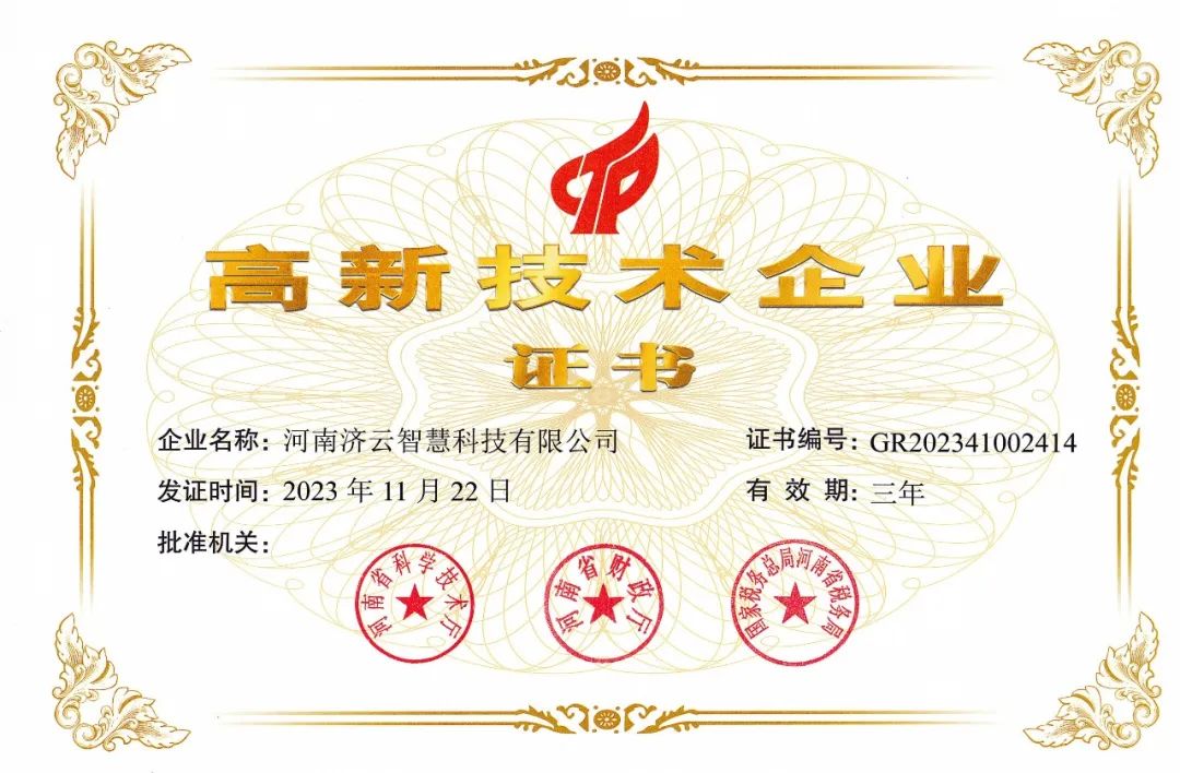 濟(jì)云智慧榮獲高新技術(shù)企業(yè)證書