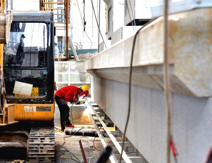 近日,記者來到濟(jì)源海關(guān)項目施工現(xiàn)場,遠(yuǎn)遠(yuǎn)就看到一座簡約又大氣的高樓,這就是即將完工的濟(jì)源海關(guān)綜合業(yè)務(wù)技術(shù)用房。高樓外墻的芝麻白花崗巖石材與赭色鋁板基本安裝結(jié)束,工人正在小心翼翼地安裝最后一根羅馬柱的干掛石材。